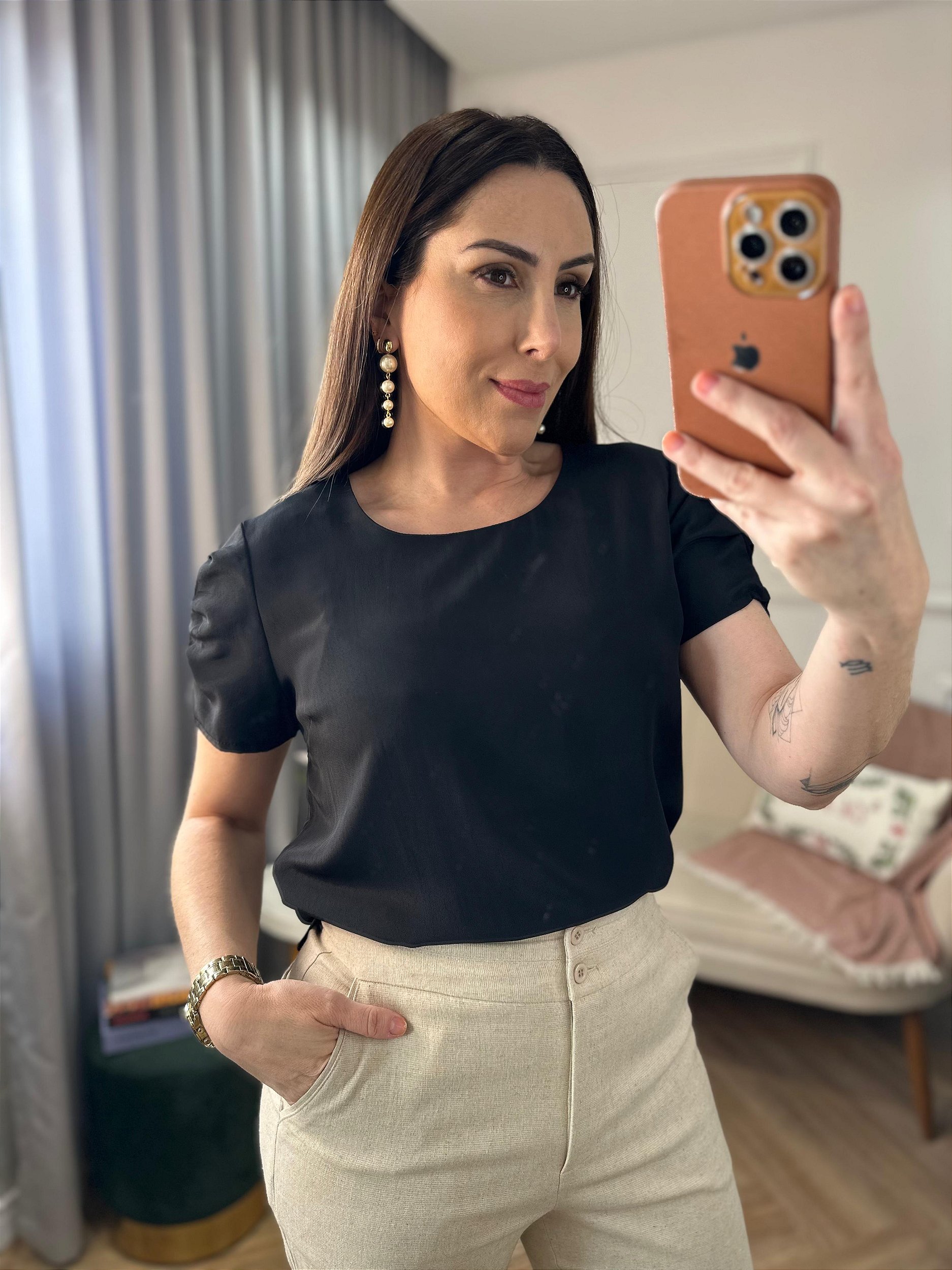 Blusa manga curta em crepe. Possui gola redonda, manga com pregas e aberturas e detalhe de martingale fixo.