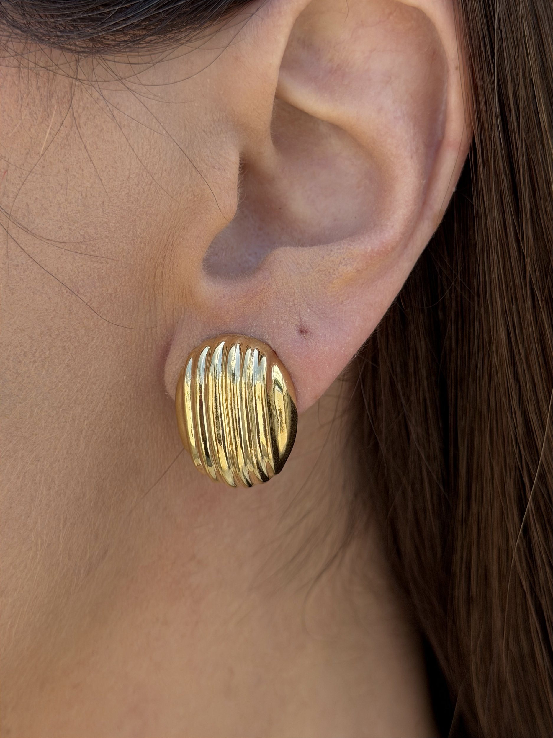 Brinco banhado a ouro 18K com design orgânico e detalhe texturizado, ideal para quem busca um visual moderno, sofisticado e cheio de personalidade.