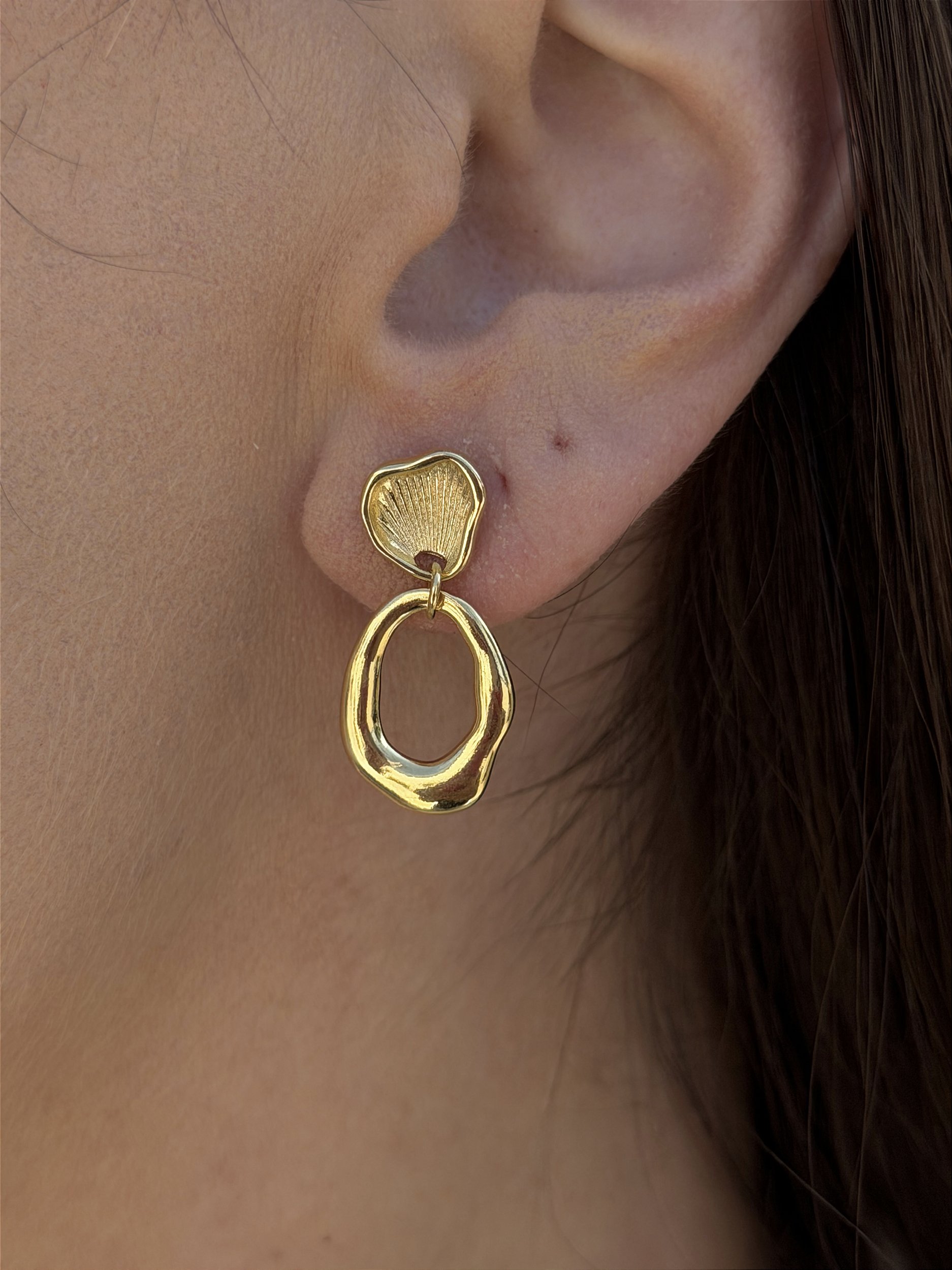 Brinco banhado a ouro 18K com design orgânico e detalhe texturizado, ideal para quem busca um visual moderno, sofisticado e cheio de personalidade.