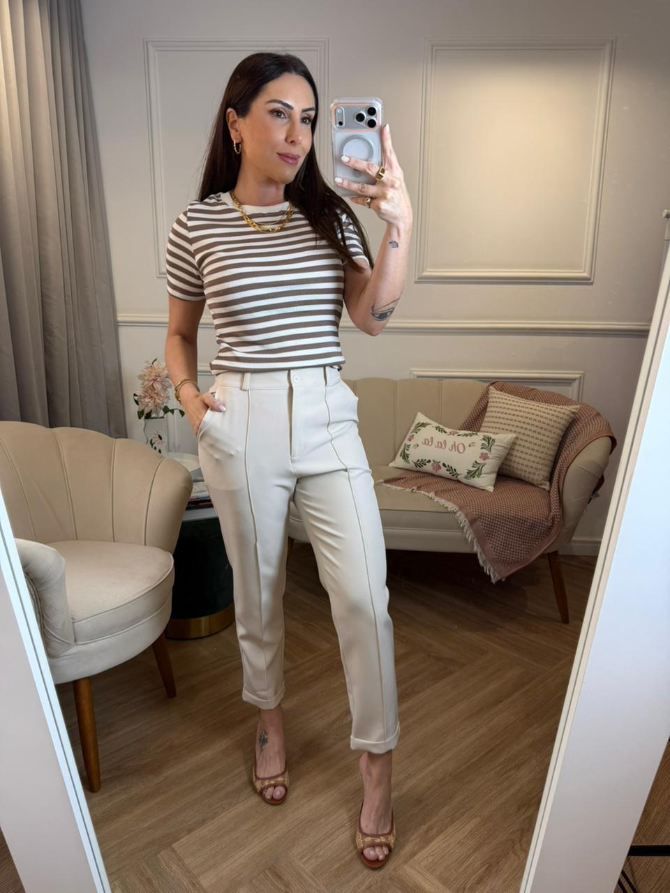 Calça com modelagem cigarrete, barra italiana, bolso faca, nervura frontal e bem acinturada