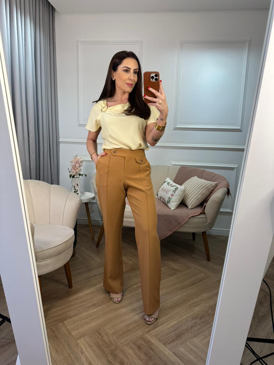 Calça pantalona confeccionada em tecido alfaiataria. Possui fechamento com botão único na vista e detalhe de lapela no bolso.