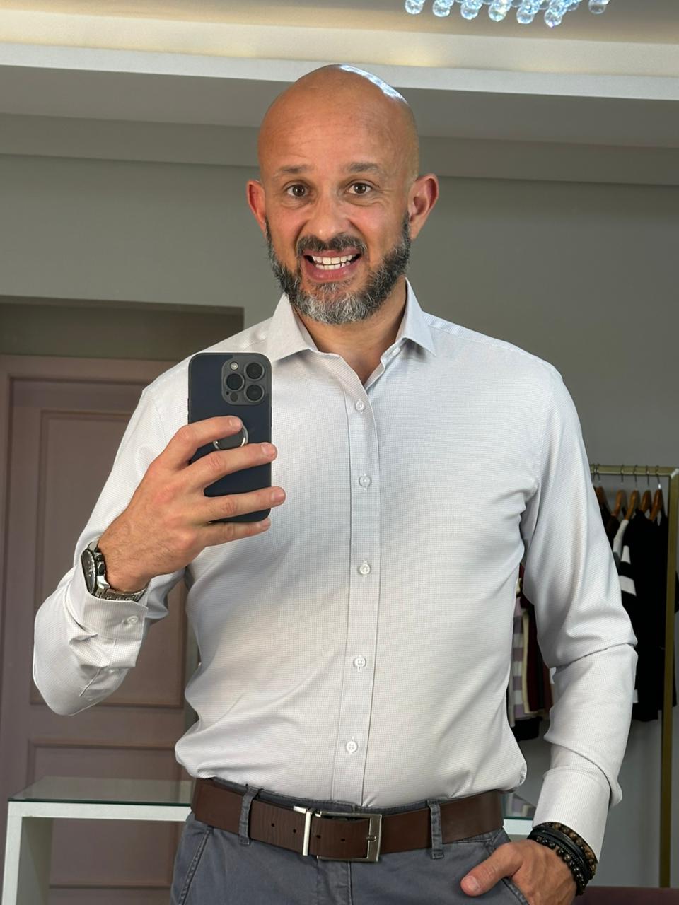 Camisa social masculina em Fibra Natural de Bambu com Elástano, modela-se ao corpo, é muito confortável, leve e com toque extremamente macio. Proporciona uma sensação térmica agradável e confortável, por ser um tecido de Fibra Natural. Passa fácil e não amassa, uma peça excelente para os dias mais quentes.