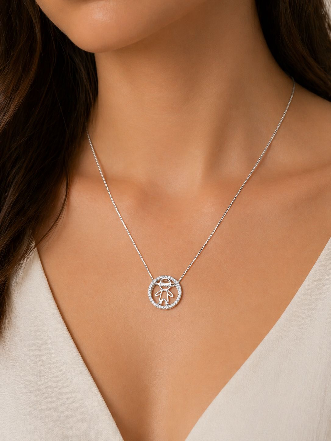 Colar Círculo Vazado com Menino e Micro Zircônia Semijoia Ródio Branco