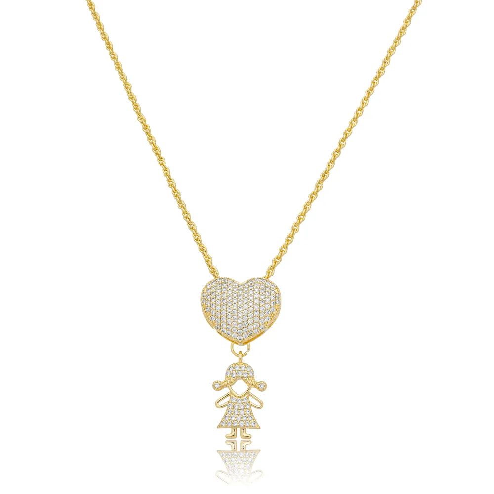 Colar Cordão Baiano com Coração e Menina Cravejada 50cm Semijoia Ouro 18K
