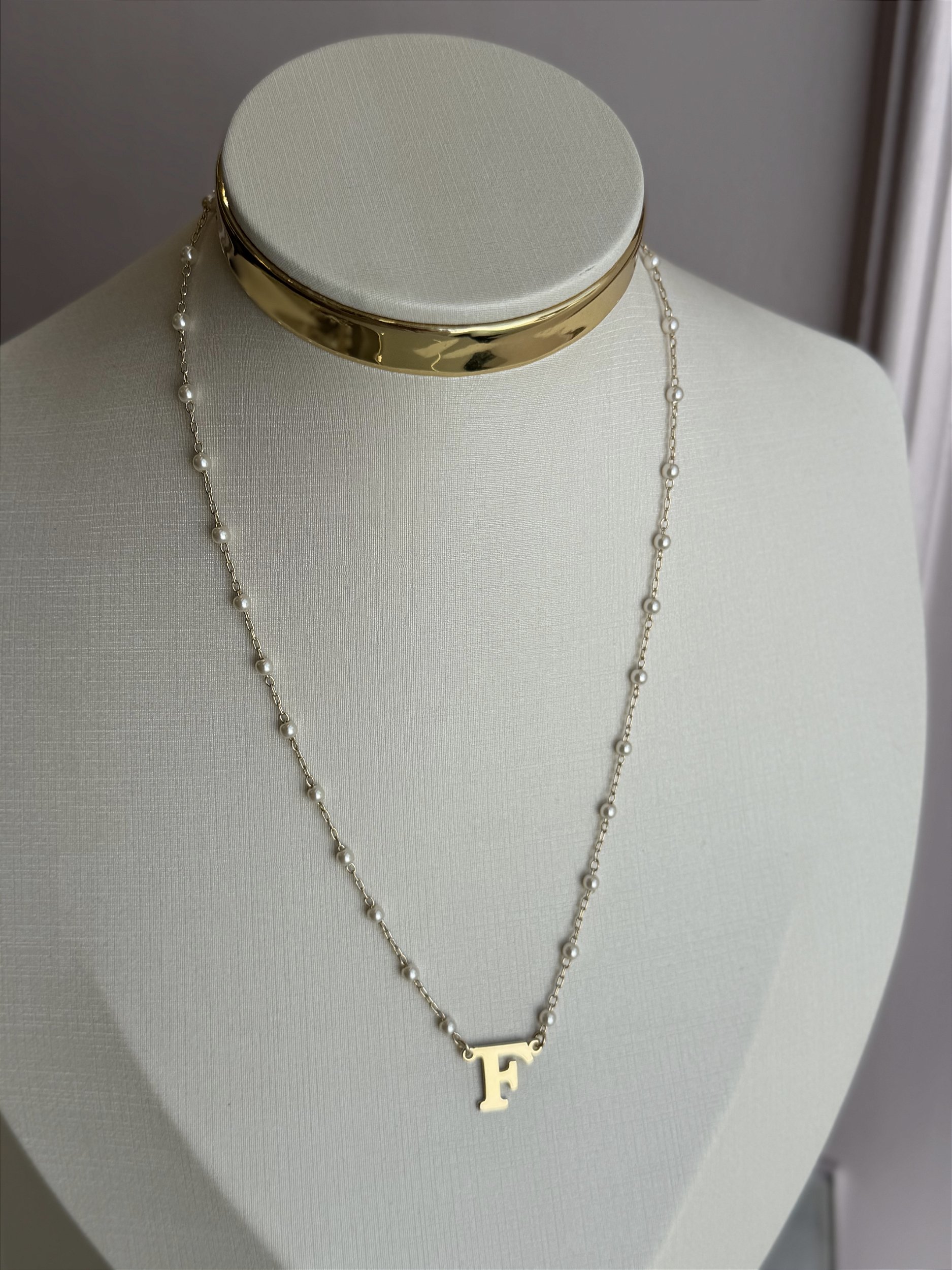 Colar letra F pérola dourado