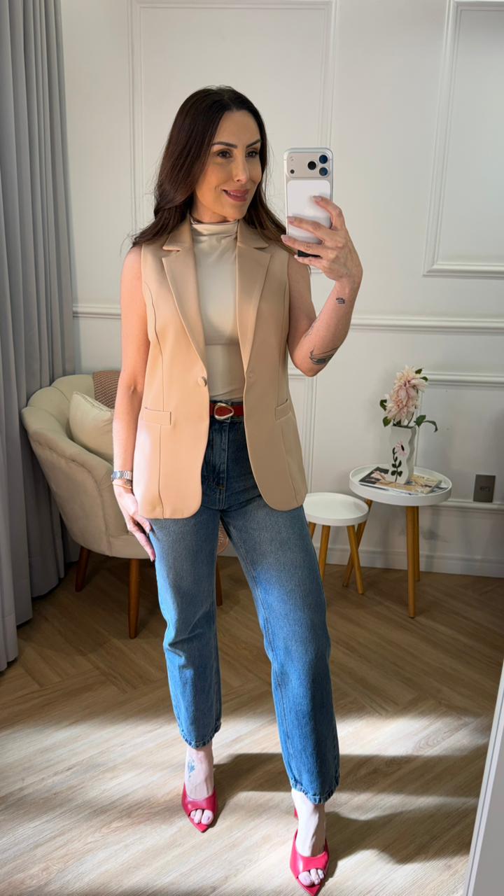 Peça versátil, ideal para composições formais ou contemporâneas, podendo ser usada sozinha ou sobreposta a camisas e blusas, além de combinar perfeitamente com calças de alfaiataria coordenadas.