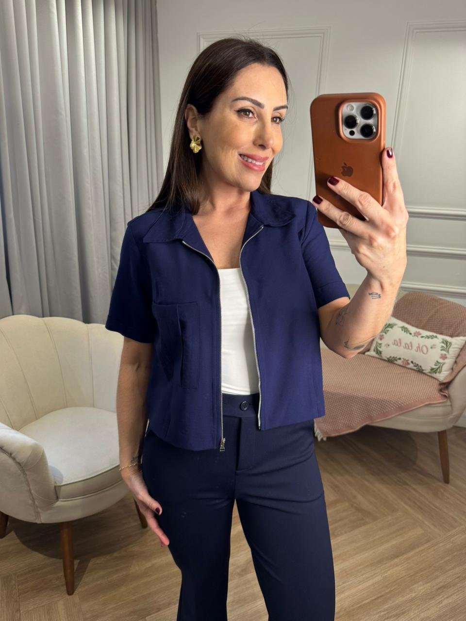 Colete confeccionado em tecido plano alfaiataria, gola de camisaria, contém zíper na vista, bolso na lateral e detalhe de dobra na manga.