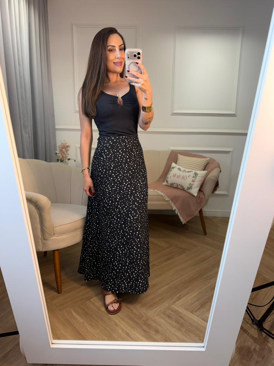 Saia longa estampada de poá, com design clássico e atemporal. Possui modelagem reta com leve abertura na barra, garantindo movimento e um caimento fluido. O cós com elástico proporciona conforto e melhor adaptação ao corpo, enquanto o fechamento em zíper garante praticidade e um acabamento mais estruturado.