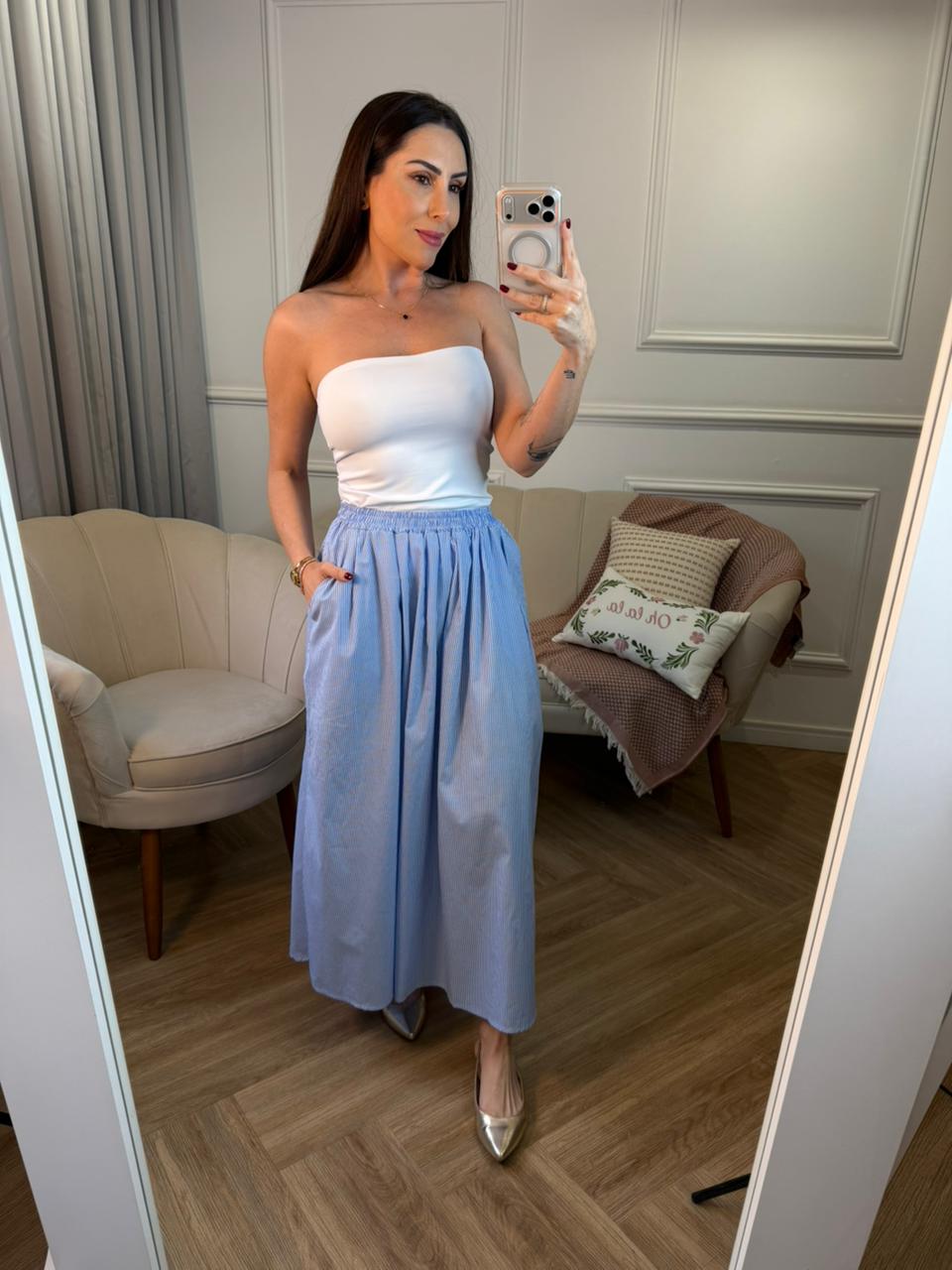 Saia mídi, com caimento leve e fluido, perfeita para composições femininas e versáteis. Possui cintura alta com cós elástico, garantindo conforto e ajuste ao corpo, além de recorte com leve franzido, que adiciona movimento e delicadeza ao visual. O comprimento mídi traz elegância e praticidade, ideal para diferentes ocasiões.