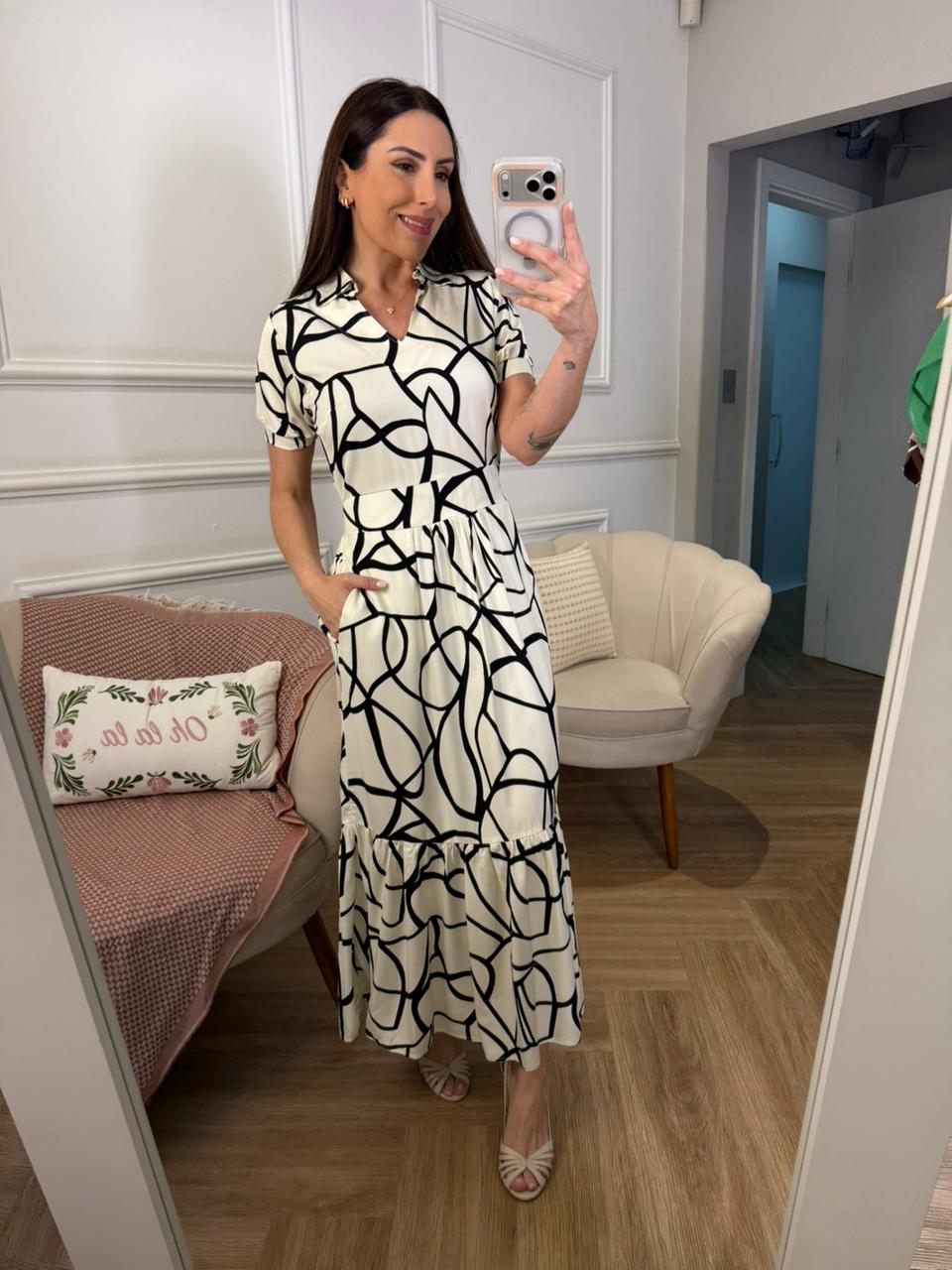 Vestido longo com estampa elegante e design atemporal, ideal para produções que pedem conforto com sofisticação. O modelo possui uma maria na saia, que garante movimento e leveza ao look, além de bolsos funcionais, trazendo praticidade para o dia a dia.