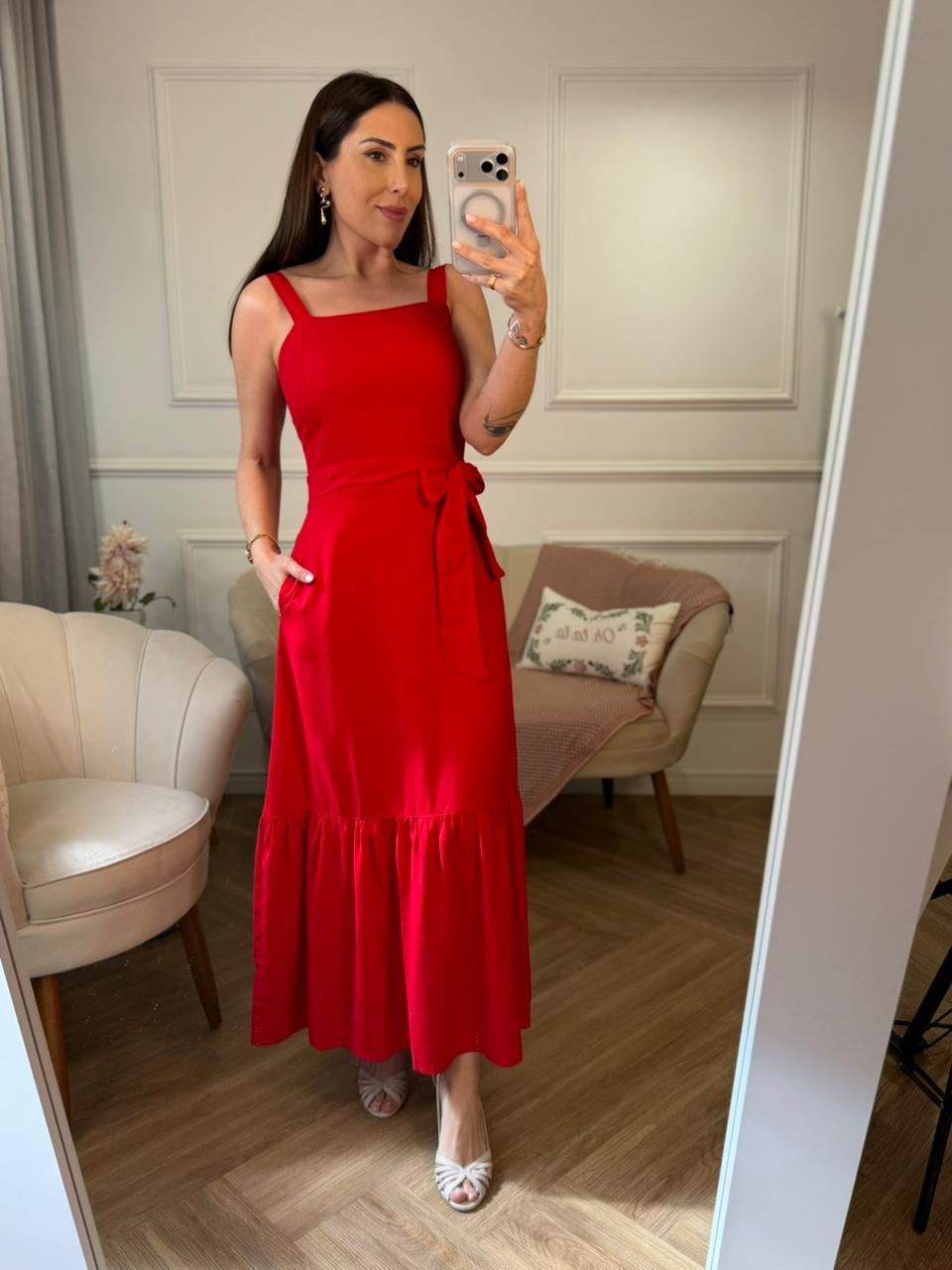 A saia possui uma maria, trazendo movimento e leveza à peça, além de bolsos funcionais, que unem praticidade e estilo no dia a dia. O vestido acompanha faixa do mesmo tecido, permitindo marcar a cintura e criar diferentes propostas de uso.