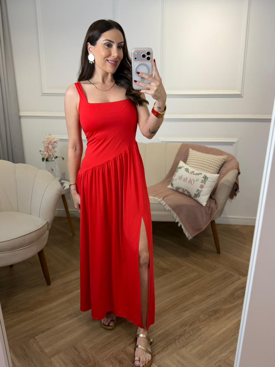 Vestido longo em tecido leve e fluido, com decote reto e alças médias, que valorizam o colo com um visual clean e feminino. Possui recorte levemente abaixo do busto, proporcionando um caimento soltinho e confortável ao longo do corpo.